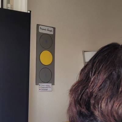 Bereits beim betreten der KiTa fällt einem die Personalampel am Eingang auf, die Kindern, Eltern, Großeltern und Besuchern die tagesaktuelle Personalsituation zeigt.